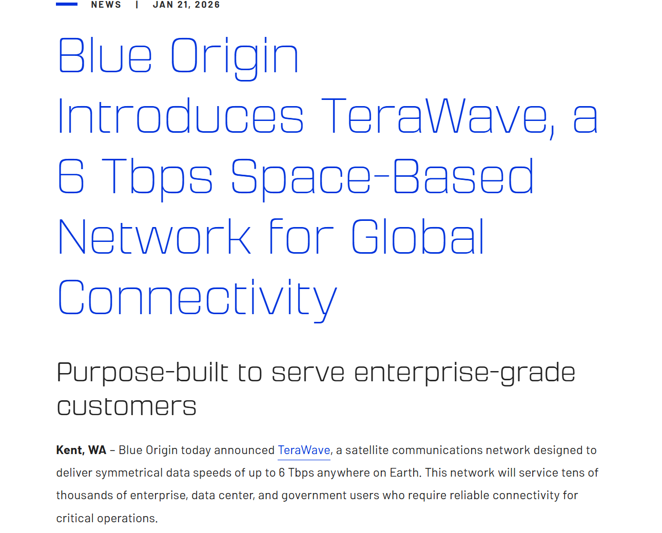 在周三发布的公告中,蓝色起源推出TeraWave卫星通信网络名,核心卖点是向地球任何地点提供高达6Tbps的对称数据传输速度,相当于6000条千兆宽带同时跑满。