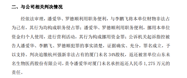 2月19日,未名医药发布公告。经法院审理,公司原实控人潘爱华,犯职务侵占罪、挪用资金罪,被判处有期徒刑十三年。