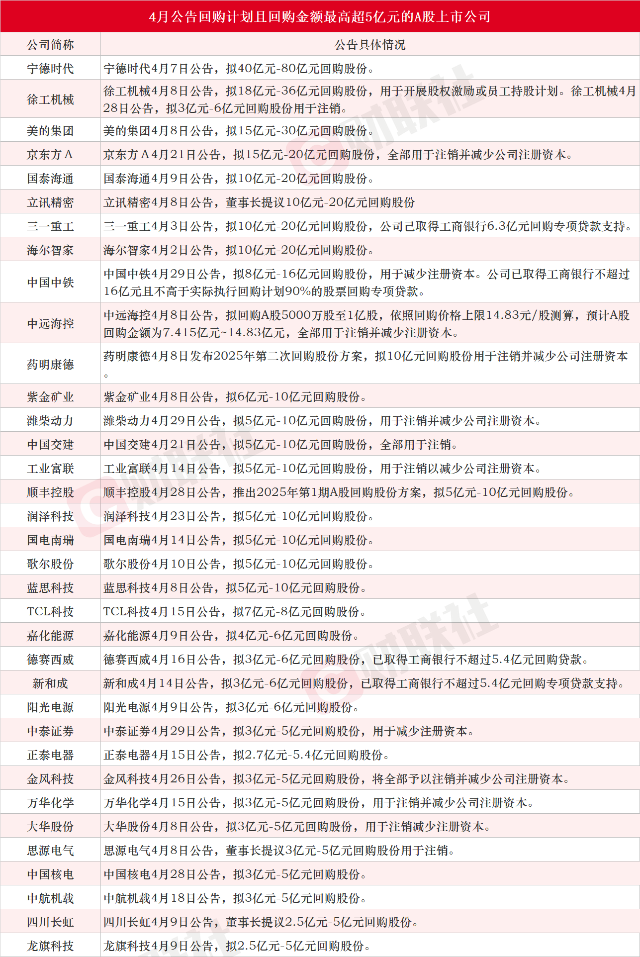 伴随着政策的密集鼓励与引导,A股4月再掀回购热潮。据不完全统计,截至发稿,4月包括宁德时代、徐工机械、美的集团、京东方A、国泰海通、立讯精密、三一重工、海尔智家、中国中铁、中远海控、药明康德、紫金矿业、潍柴动力、中国交建、工业富联、顺丰控股、润泽科技、国电南瑞、歌尔股份、蓝思科技、TCL科技、嘉化能源、德赛西威、新和成、阳光电源、中泰证券、正泰电器、金风科技、万华化学、大华股份、思源电气、中国核电、中航机载、四川长虹和龙旗科技在内的35家A股上市公司发布回购计划公告且回购金额最高超5亿元,具体情况如下图: