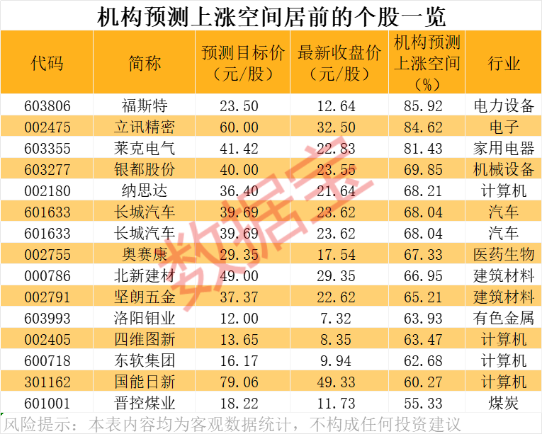 本周机构评级的个股中,14股最新收盘价较机构预测目标价上涨空间超60%,其中福斯特上涨空间达85.92%,居于首位。