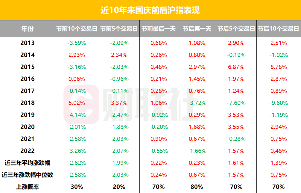 从统计来看,2013年-2022年10年间,无论是国庆节前10个交易日,还是节前5个交易日,沪指都是跌多涨少,上涨概率分别为30%和20%,但节前最后一天上涨概率较大,达到70%。