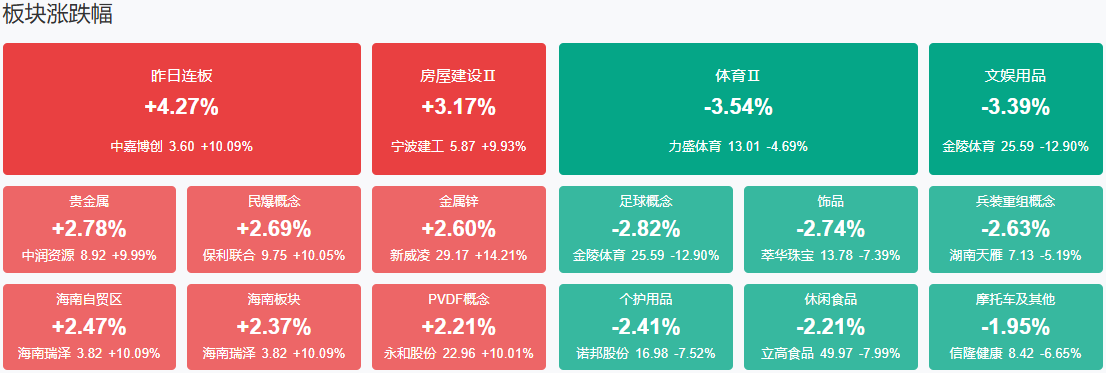 板块方面,民爆、农药、算力租赁、海南等板块涨幅居前,足球概念、美容护理、IP经济、宠物经济等板块跌幅居前。截至收盘,沪指跌0.06%,深成指跌0.18%,创业板指跌0.48%。
