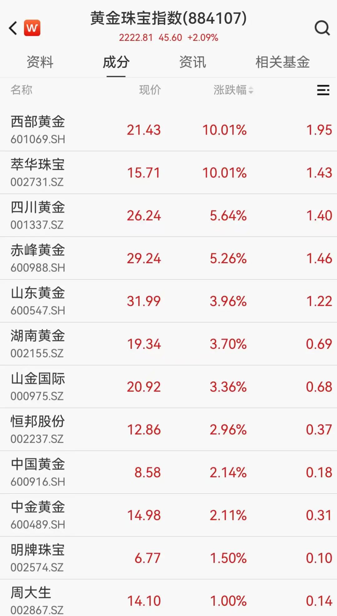 证券市场方面,A股、港股黄金珠宝板块共振。万得黄金珠宝指数逆市上涨2.09%,萃华珠宝、西部黄金涨停;四川黄金、赤峰黄金均涨逾5%。