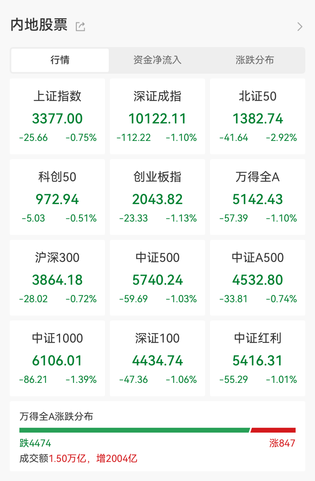 6月13日,A股全天“水下震荡”。截至收盘,沪指跌0.75%,深证成指跌1.1%,创业板指跌1.13%。全市场847股上涨,超4400股下跌;成交额15039.97亿元,较昨日放量约2004亿元,换手率3.75%。