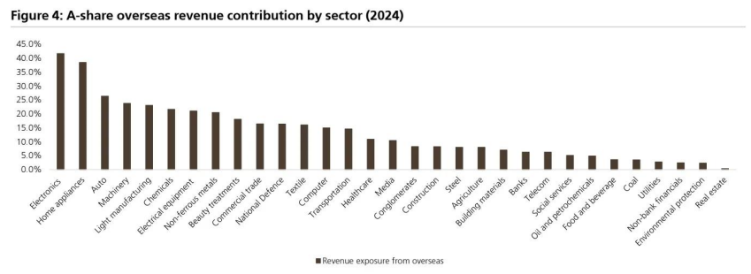 瑞银集团(UBS)的中国经济学家预计,目前美国对中国商品的加权平均关税税率约为 43.5%。从微观层面来看,2024 年非金融类 A 股上市公司的海外营收占比为 14.3%,电子和家电行业的这一比例更是超过三分之一(见图 4)。