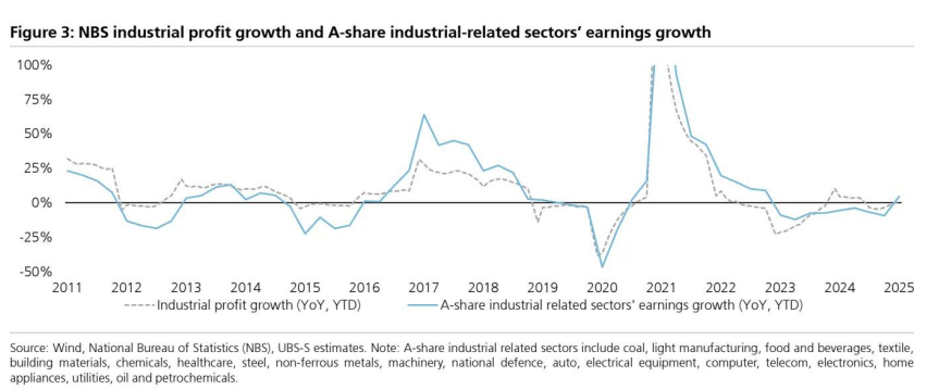 在瑞银对 2025 年第一季度 A 股收益的回顾中发现,由于 2025 年第一季度国内生产总值(GDP)增长加快,A 股整体收益同比增长 3.5%,非金融类 A 股收益同比增长 4.2%,这与国家统计局公布的当季工业利润同比转正相符(见图 3)。
