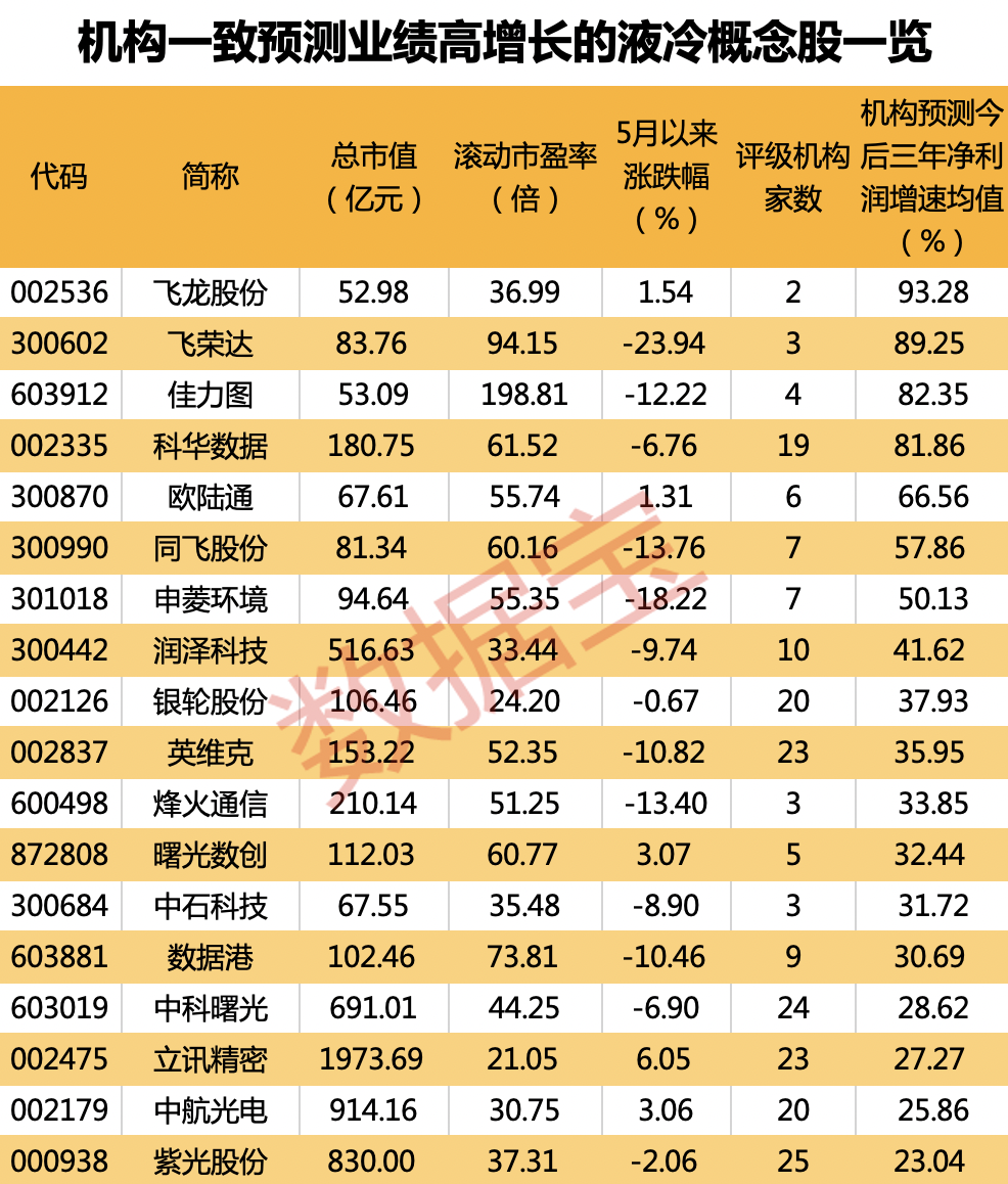 从未来增长潜力来看,按照2家及以上机构一致预测,18只概念股今、明、后三年净利润增速均有望超20%,分别为紫光股份、中科曙光、英维克、科华数据、曙光数创等。