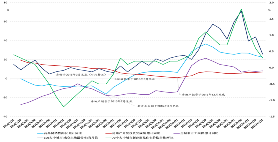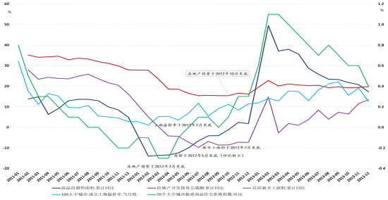 在2012年房地产复苏周期内,房地产销售于2月见底,土地溢价率于2月见底,房价于5月见底,反映土地市场与房屋市场同时回暖,房屋市场的量领先于价。新开工于7月见底,投资于10月见底。在2015年房地产复苏周期内,销售于2月见底,房价、土地溢价率和新开工于3月见底,投资于12月见底。