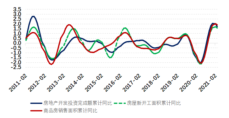 在这之前,该指标在0值以上有14个月,这反映了该指标在周期上的不对称性。与之相反的是,房地产开发投资的周期项往往在波峰附近停留较久,这和原始数据中,房地产开发投资额的累计同比增速在上升周期后逐步缓慢下降所对应。