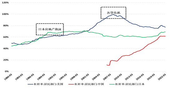 中国的居民部门杆杆率仍然存在空间,房贷对于居民福利的影响有限,购房潜在需求仍然长期存在。存在观点认为中国的居民部门杆杆率过高,未来没有加杠杆的空间,并且高杠杆率可能带给中国类似日本与美国的房地产泡沫破灭现象。