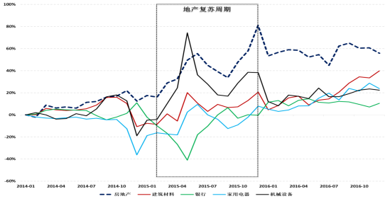 房地产短周期内的地产链投资路径可能是:机械设备率先启动,但是持续性比较弱,房地产板块在整个房地产复苏周期表现最强,房地产板块见顶后,建筑材料和家用电器持续性较强。我们选取房地产复苏周期开始前的第12个月作为基期,用行业指数相对基期比值与沪深300指数相对基期比值之差作为超额收益。