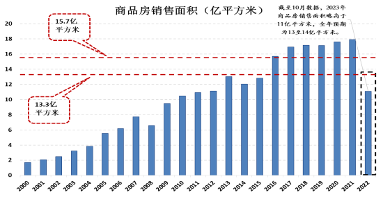 2022年1-10月的销售面积为11亿平方米,全年预期为13至14亿平方米,低于短期的合理面积,因此2022年的行业景气度过快下行可能是一次性的冲击,房地产行业的中长期趋势可能是稳定向下,2023年后房地产行业可能会恢复到合理区间。