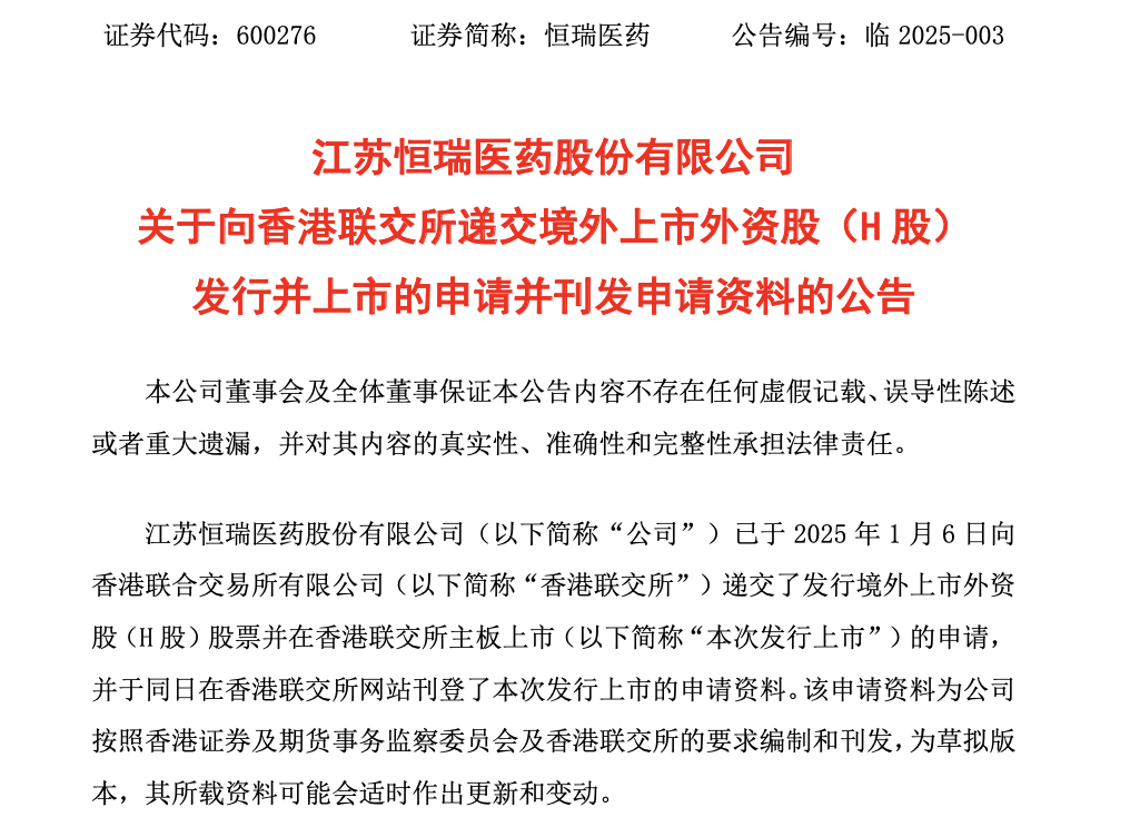 2025年1月6日,恒瑞医药正式递交港交所主板上市申请,拟赴港上市,未来有望实现“A+H”两地上市。