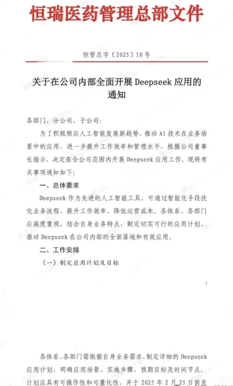 据网传文件要求,恒瑞医药各体系、各部门需根据自身业务需求,制定详细的DeepSeek应用计划,明确应用场景、实施步骤、预期目标及时间节点,推动DeepSeek在公司内部的全面落地和有效应用。