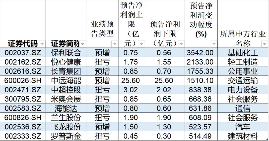 (目前业绩预告增速前十的公司,数据来源:Wind)