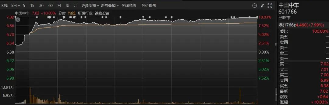 轨交装备概念高开高走,板块指数放量大涨逾7%。中国中车强势涨停,K线图上呈现阳包阴走势,铁大科技、铁科轨道、雷尔伟等也纷纷涨停或涨超10%。