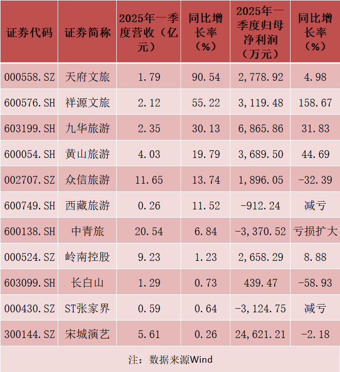 伴随旅游热度的攀升,旅游及景区行业上市公司也延续良好的增长态势。Wind数据显示,23家旅游及景区上市公司今年一季度实现营业收入73.42亿元,同比增长3.45%。
