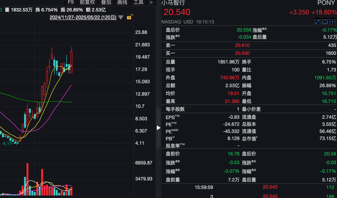 5月20日,自动驾驶企业小马智行发布未经审计的2025年第一季度财报。财报显示,小马智行第一季度总营收为1.02亿元,同比增长12%;其中Robotaxi业务收入达1230万元,同比增长200%。