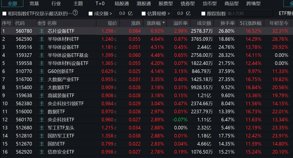 截至11月8日收盘,半导体材料设备主题ETF领涨市场,最高涨近7%;新兴产业、大数据产业、高端设备等主题ETF也涨幅居前。不过,半导体行业ETF整体表现较弱。