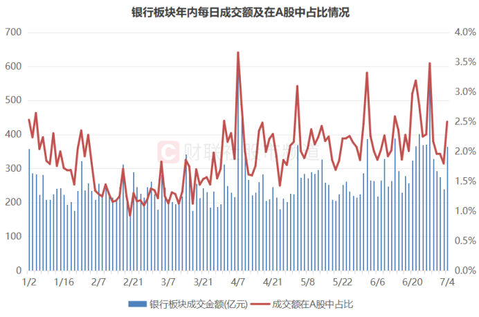 注:银行板块年内每日成交额及在A股中占比情况(截至7月4日收盘)