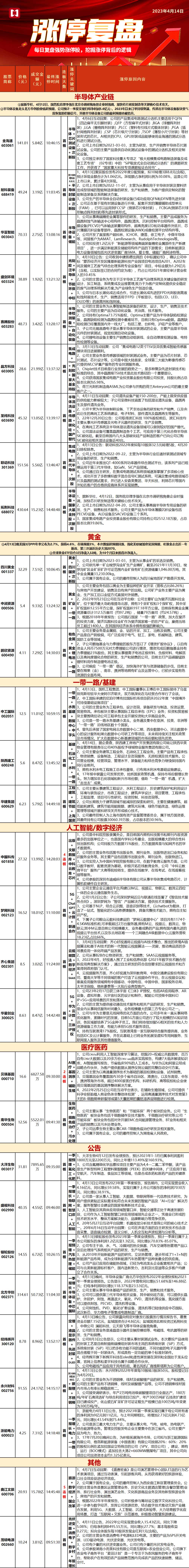 【4月14日】今日周五,今日共31股涨停,8股炸板,封板率为79%;盘面上,收涨个股2655只,收跌个股2102只;板块方面,半导体、贵金属、锂矿、汽车整车等板块涨幅居前,旅游、电商、传媒、手机游戏等板块跌幅居前。