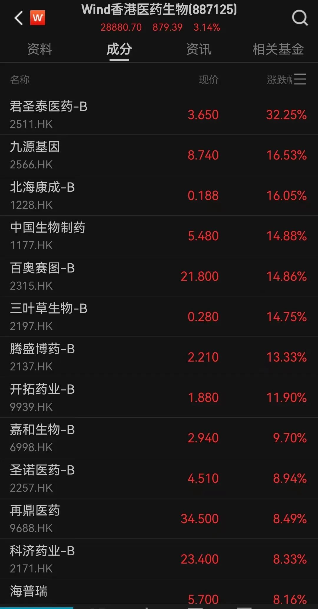 港股市场主要行业板块中,医药板块大涨,中国生物制药盘中一度大涨逾17%,美中嘉和盘中一度大涨逾11%,再鼎医药盘中亦一度上涨逾11%。