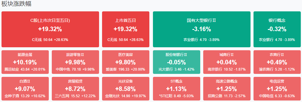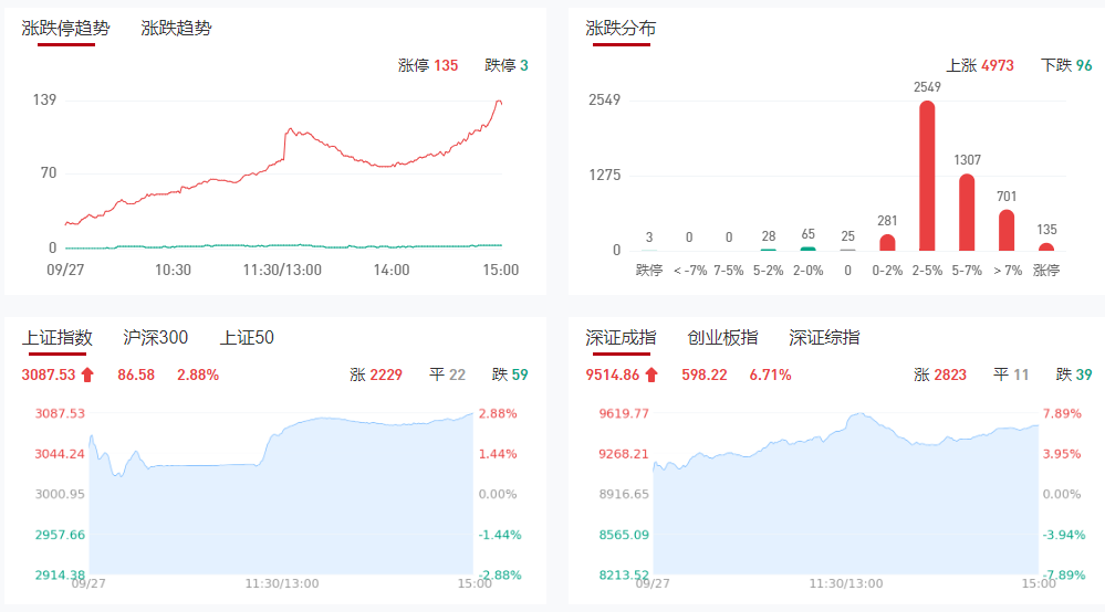 盘面上,创业板权重股集体大涨,东方财富涨停,宁德时代涨超10%。大金融及金融科技股持续大涨,中信证券、天风证券、银之杰、安硕信息等多股涨停。锂电池、光伏等赛道股展开反弹,领湃科技、金杨股份、金刚光伏、福莱特等涨停。白酒股维持强势,舍得酒业、古井贡酒、酒鬼酒、五粮液等涨停。地产股震荡走高,金地集团、阳光股份、万科A、金融街等涨停。下跌方面,银行股冲高回落,建设银行跌超4%。整体看,全市场超5200只个股上涨,逾百股涨停。