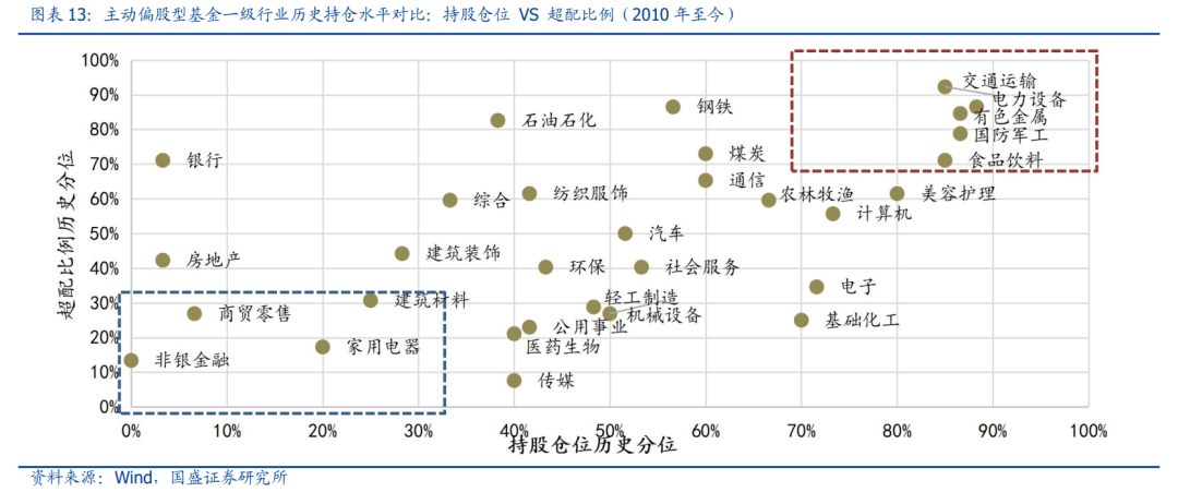 历史视角下,行业配置分化依旧显著。综合行业仓位及行业超配比例观测,当前基金的行业配置分化依旧显著,其中交通运输、电力设备、有色金属、国防军工与食品饮料不仅仓位仍处相对高位,超配比例也处于历史高位;而非银金融、商贸零售、家用电器和建筑材料等则不仅仓位降至底部,且超配比例也降至低位,其中非银金融仓位更是刷新了2010年以来的新低。落脚细分行业,一方面,前期高位运行的细分方向已普遍有所回调,仅化学原料、金属新材料、工业金属、家电零部件和航运港口仓位仍处95%历史分位上方;另一方面,银行、地产等细分方向的仓位则连续回落,其中股份制银行、饮料乳品仓位刷新2010年以来新低,房地产开发和国有大型银行仓位也处于历史底部。