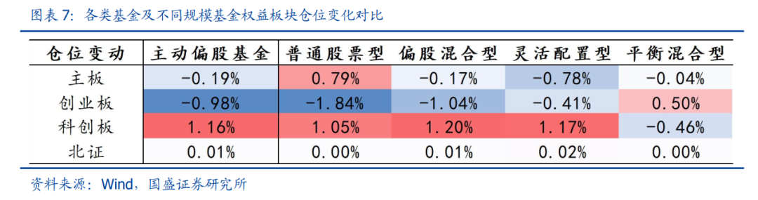 板块方面,科创板获一致性加仓,仓位续创新高。一季度基金主板仓位延续下行,较四季度环比降低0.19%,双创调仓显著分化,创业板仓位回落0.98%,科创板仓位则继续攀升1.16%,续创历史新高。具体而言,除平衡混合型基金外,主动偏股基金一致性加仓科创板并减仓创业板,主板则仍存分歧。截止一季度末,主动偏股基金在主板、创业板、科创板和北交所仓位分别达到70.2%、20.6%、9.1%和0.1%。