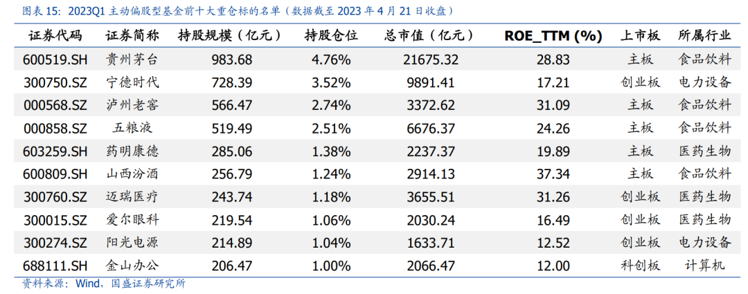 持股集中度延续下行,刷新近5年新低。截至一季度末,公募前20、前50和前100重仓股持股占比较上季环比回落,分别达到28.1%(前值30.3%)、42.1%(前值45.6%)和55.6%(前值59.3%),续创2018年以来的新低,个股层面的持股“抱团”持续趋弱。从重仓股层面看,前五大重仓位次稳固,依次为贵州茅台、宁德时代、泸州老窖、五粮液和药明康德,同时重仓名单新增金山办公且亿纬锂能退出前十大重仓。