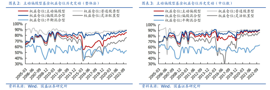 权益仓位继续抬升,刷新2005年以来峰值。整体法视角下,主动偏股型基金权益仓位上升1.13%,达到84.76%,刷新2005年以来仓位新高。其中普通股票型、偏股混合型、灵活配置型和平衡混合型基金的权益仓位分别达到89.59%(+0.51%)、88.27%(+0.87%)、76.04%(+1.78%)和52.95%(+1.29%)。中位数视角下,主动偏股型基金权益仓位四季度环比上行0.97%,达到89.83%,刷新2005年以来新高。其中普通股票型、偏股混合型、灵活配置型和平衡混合型基金的权益仓位分别达到91.62%(+0.69%)、90.56%(+0.95%)、86.12%(+1.25%)和63.55%(+1.16%)。
