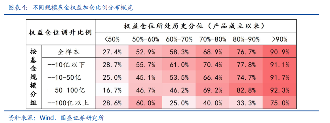 具体而言,一季度基金权益仓位及调整呈现三个特点:其一,中小基金加仓意愿相对更强,按市值分组看,百亿及以下规模的基金加仓比例相对更高;其二,高仓位基金继续加仓意愿相对更强,结合产品历史权益仓位分布统计,权益仓位已处高位的基金加仓占比相对更高;其三,基金权益仓位高低分化较为显著,权益仓位处于90%及以上历史分位或低于历史中枢的基金比例相对更高,处于中游水平的基金比例相对偏低。