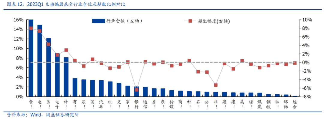 一季度新能源仓位大幅回落,TMT配置显著抬升,消费板块配置走向分化。从绝对仓位变动来看,一级行业中计算机、通信、食品饮料、传媒、家用电器仓位提升居前,分别环比增加3.82%、0.91%、0.82%、0.53%、0.37%,而电力设备、国防军工、银行、房地产和商贸零售仓位回落居多,分别环比降低2.95%、1.05%、1.04%、0.61%和0.56%。二级行业中,软件开发、白酒、计算机设备、通信设备和IT服务仓位提升居前,分别环比增加2.37%、0.99%、0.90%、0.62%和0.55%,而光伏设备、电池、医疗服务、航空装备和房地产开发仓位回落居多,分别环比降低1.32%、1.09%、0.81%、0.73%和0.61%。总结来看,一季度基金行业配置由新能源向TMT快速倾斜,TMT仓位合计抬升5.60%,电力设备、汽车及军工仓位则合计缩减4.33%;与此同时,消费板块内部则走向分化,其中商品类的白酒、中药、化学制药、白色家电和黑色家电仓位合计回升2.08%,而服务类及疫后出行相关的医疗服务、旅游零售、酒店餐饮、医疗美容、饮料乳品仓位合计回落1.68%。