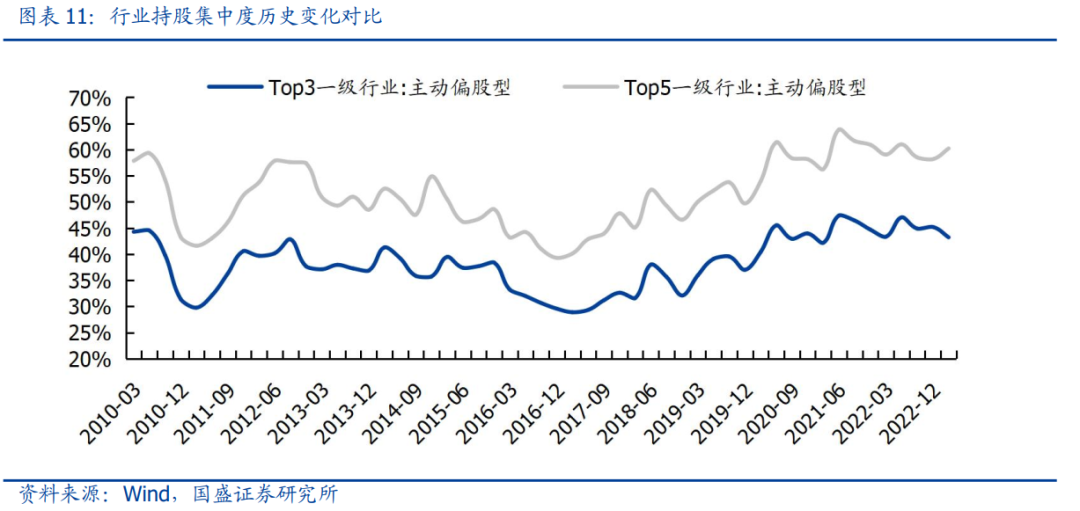 行业集中度走向分化,配置轮动仍以头部行业为主。从静态持仓来看,食品饮料、电力设备、医药生物、电子和计算机稳坐前五大重仓行业,仓位分别达到16.4%、14.8%、12.0%、8.9%和8.1%。与此同时,行业持股集中度在一季度有所分化,Top3重仓的一级行业持股占比环比降低2.0%,而Top5重仓一级行业持股占比则环比提升2.0%,表征基金调仓更多集中于前五大重仓行业,行业配置依旧高度集中,只是配置重心从新能源向TMT与消费有所偏移。