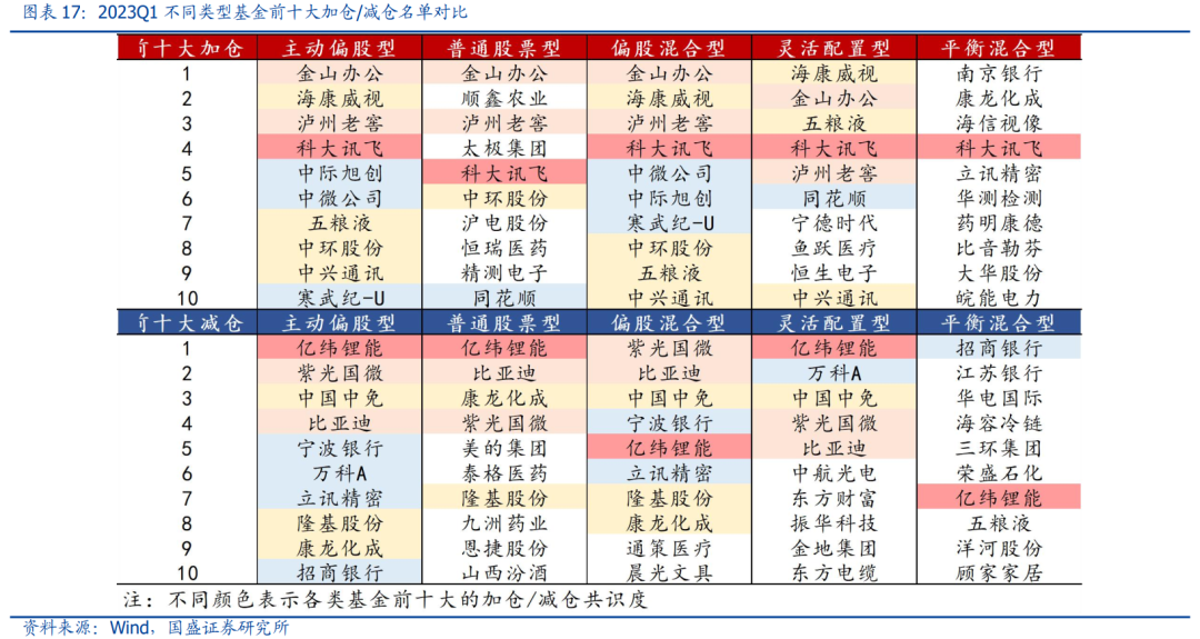个股层面,金山办公获加仓居多,亿纬锂能遭减仓居多。从个股仓位调整来看,金山办公、海康威视、泸州老窖、科大讯飞、中际旭创仓位提升居多,仓位增加0.63%、0.55%、0.40%、0.37%、0.27%;同时亿纬锂能、紫光国微、中国中免、比亚迪、宁波银行仓位回落居多,仓位分别回落0.63%、0.60%、0.53%、0.52%和0.36%。此外,结合四类基金加减仓名单,科大讯飞、金山办公和泸州老窖加仓共识较强,亿纬锂能、紫光国微、比亚迪减仓共识较强。