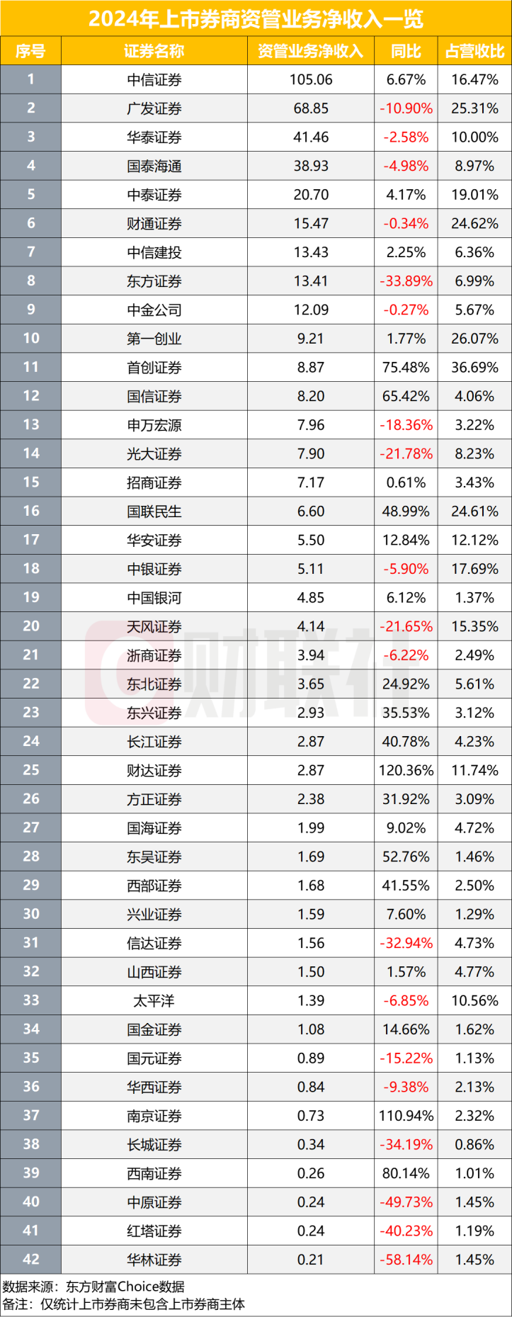 资管净收入排名前十的券商分别是中信证券(105.06亿元)、广发证券(68.85亿元)、华泰证券(41.46亿元)、国泰海通(38.93亿元)、中泰证券(20.7亿元)、财通证券(15.47亿元)、中信建投(13.43亿元)、东方证券(13.41亿元)以及中金公司(12.09亿元)。