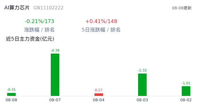 AI算力芯片板块在6月26日出现日线级别熊点。虽然60分钟处于牛点区间,短期有所弱势反弹,但指数目前整体处于中期下降通道。建议在日线级别未转为牛点信号前继续谨慎观望。从板块走势与资金的配合程度看,AI算力芯片 5日累计涨幅0.41%,排名概念第148名,57%个股上涨。5日和1日主力均流出,但已经能看到流出速度减慢。