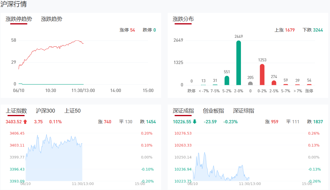 市场早盘震荡分化,三大指数涨跌不一。沪深两市半日成交额7886亿,较上个交易日缩量344亿。盘面上热点快速轮动,个股跌多涨少,全市场超3300只个股下跌。从板块来看,创新药概念股维持强势,赛升药业等涨停。足球概念股反复活跃,共创草坪7连板。银行股再度走强,兴业银行等多股创历史新高。下跌方面,军工股展开调整,捷强装备跌超10%。