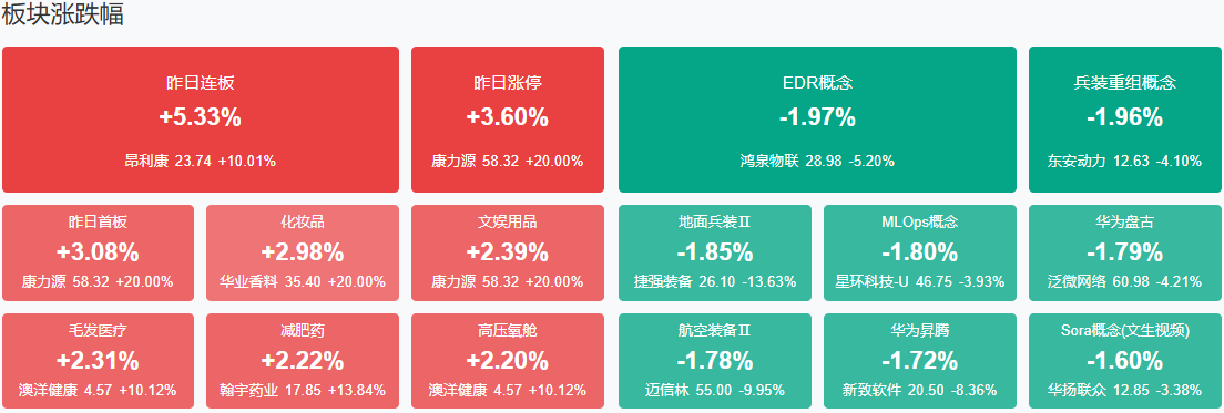 板块方面,美容护理、创新药、电池、足球概念等板块涨幅居前,华为昇腾、军工、国资云、人形机器人等板块跌幅居前。截至收盘,沪指涨0.11%,深成指跌0.23%,创业板指跌0.36%。