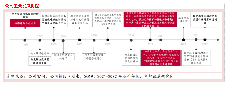 1999年,彻底解决变压器渗透油问题;2009年,空心复合绝缘子和支柱复合绝缘子分别在中国首条特高压交直流中应用;董事长马斌作为主要参与人之一分别于2012、2017年两次获得国家科技进步特等奖;2019年上交所主板上市;2021年复合横担通过2021年度能源领域首台(套)重大技术装备认证,并于2022年中标英国升压增容研发项目。