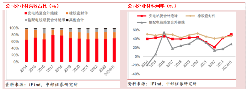具体产品营收贡献来看,2024年上半年变电站复合外绝缘、输配电线路复合外绝缘、橡胶密封件的营收占比分别为69.9%、10.3%、18.2%;毛利率分别为50.4%、28.4%、46.7%。