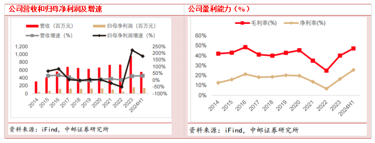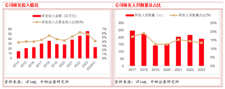 公司2014-2023年研发费用CAGR16.2%,2017-2023年研发人员数量占员工比例超12%。2024年上半年,公司研发投入为0.23亿,研发投入占营收比为4.2%,持续的研发投入和稳定的研发团队有助于公司保持核心技术优势。
