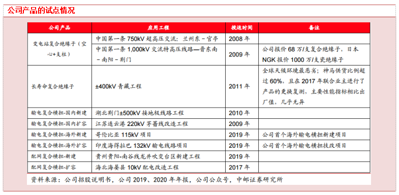 神马电力1996年成立,以电力设备用橡胶密封件起家,目前,是国际知名的电力系统复合外绝缘产品研制企业与国内电力设备用橡胶密封件龙头企业,在首条特高压交直流工程中绝缘领域进行国产替代,产品应用领域包括变电站、输电线路、配电,主要技术路线为复合绝缘子。