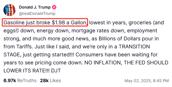 美国总统特朗普在上周发布的一条帖文中声称“美国汽油价格已经跌破每加仑2美元”,以作为催促美联储降息的论据。