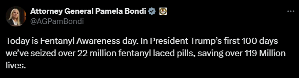 上月底,美国司法部长帕姆·邦迪(Pam Bondi)在推特发文称,司法部在特朗普政府的头100天里“缴获了超过2200万粒芬太尼药片,挽救了超过1.19亿人的生命”。