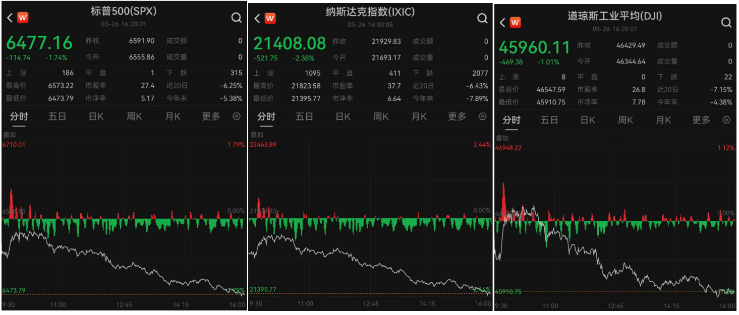 截至收盘,标普500指数跌1.74%,报6477.16点;纳斯达克综合指数跌2.38%,报21408.08点;道琼斯工业平均指数跌1.01%,报45960.11点。
