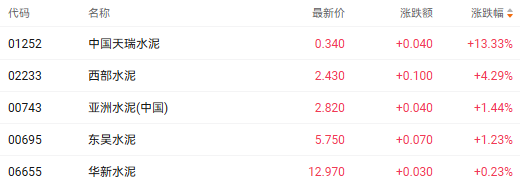 港股水泥和基建股今日早盘表现活跃。截至发稿,中国天瑞水泥(01252.HK)、西部水泥(02233.HK)、东吴水泥(00695.HK)分别上涨13.33%、4.29%、1.23%。