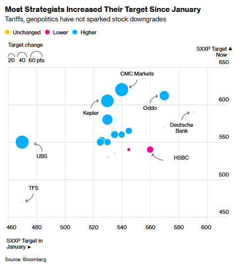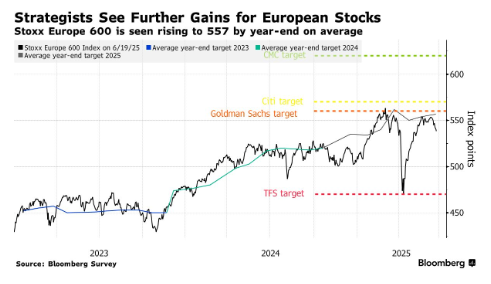 随着经济前景转暖,多数策略师已上调年初制定的保守目标。对美国股票“例外论”的质疑、欧洲经济基本面的改善,以及显著的美欧利差优势,共同推动资金持续涌入欧洲市场。