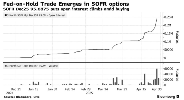 虽然目前期货和期权市场的投资者总体上仍然认为美联储将在7月份的会议上降息,并且今年至少还会再降息两次。但在过去几周,一个庞大的头寸却正在期权合约中建立——只要美联储在2025年底前维持利率不变或加息,该合约就将获利。