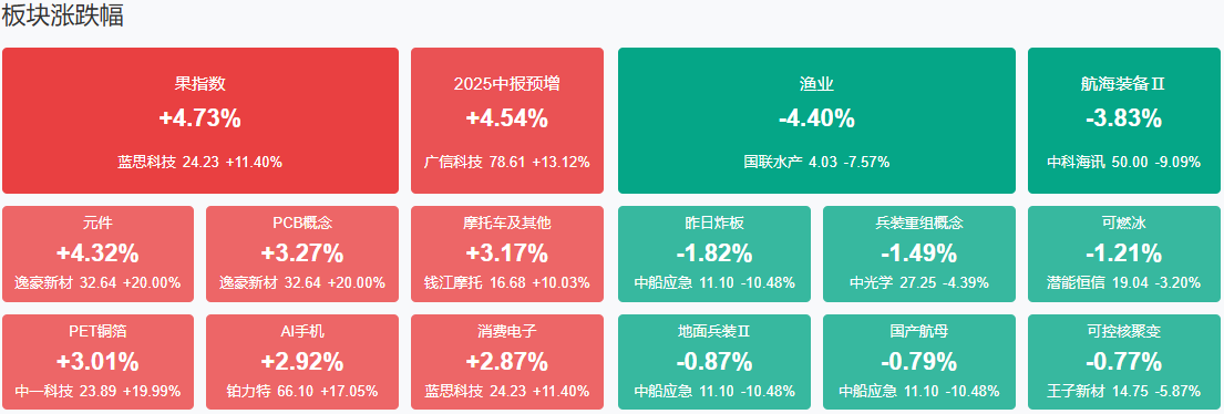 板块方面,PCB、消费电子、创新药、固态电池等板块涨幅居前,可控核聚变、海洋经济、油气、游戏等板块跌幅居前。截至收盘,沪指涨0.18%,深成指涨1.17%,创业板指涨1.9%。